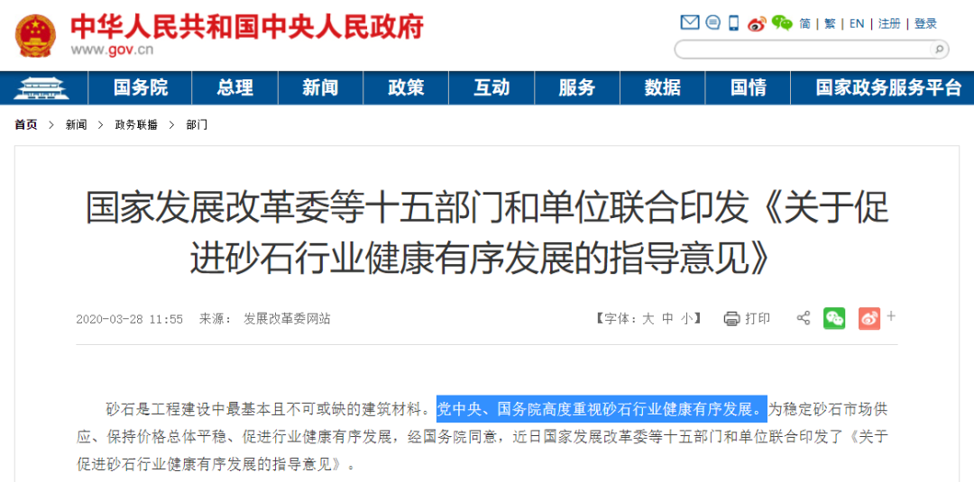中國政府網第一時間對十五部門和單位聯合印發的《關于促進砂石行業健康有序發展的指導意見》進行全文發布: