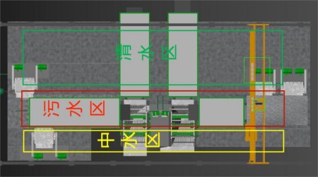四合一集水平臺污水處理系統,功能區域劃分,內部循環處理, 中水回用,每噸砂石僅補充水0.02t。當原料含泥量≤15%以內不用絮凝劑。